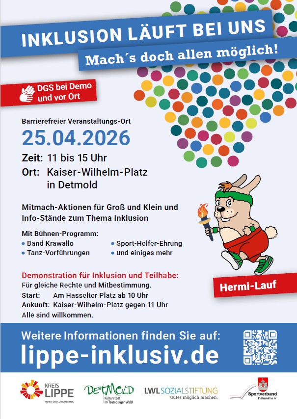 Am 25.04.2026 findet der Inklusions-Tag auf dem Kaiser-Wilhelm-Platz in Detmold statt. „Inklusion läuft bei uns – Mach´s doch allen möglich“