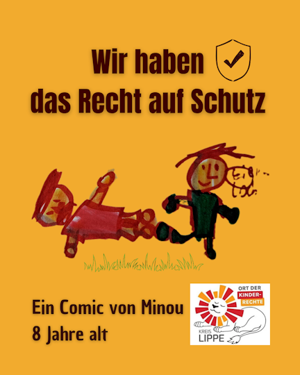 Diesen großartigen Comic mit dem Titel „Wir haben das Recht auf Schutz!“ hat die 8-Jährige Minou für euch gemalt und