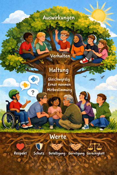 Ich erzähle euch von unserem Baum. Dem Werte-Baum. Ihr Erwachsenen sagt oft, dass Kinderrechte bei euch wichtig sind. Ich glaube