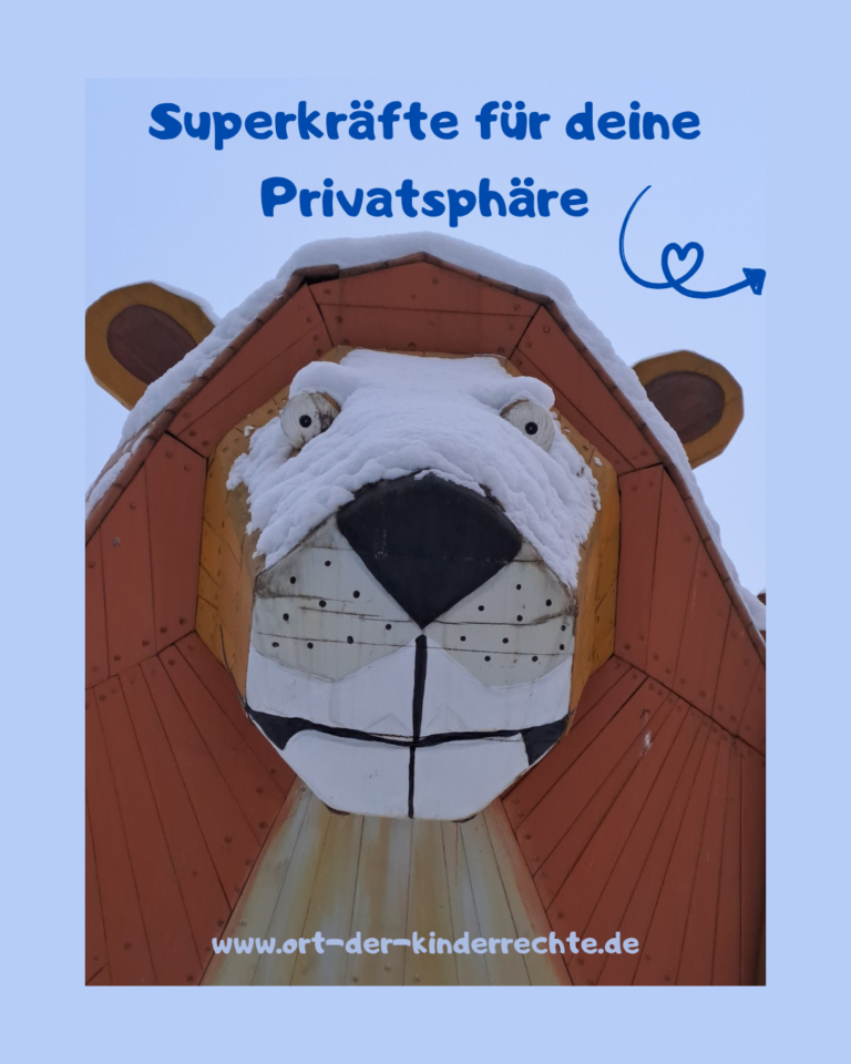 Wachsam, stark und mit einer Superhelden-Maske aus Schnee. Er steht für das Recht auf Privatsphäre: dein Raum, deine Grenzen. 🦁💛